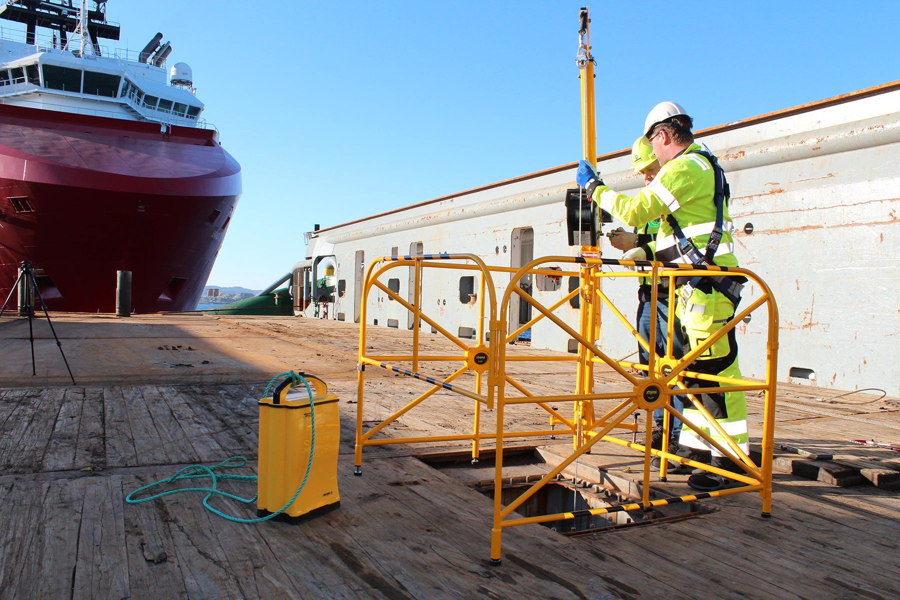 The only lightweight mobile guardrail with an integrated davit arm on the market.